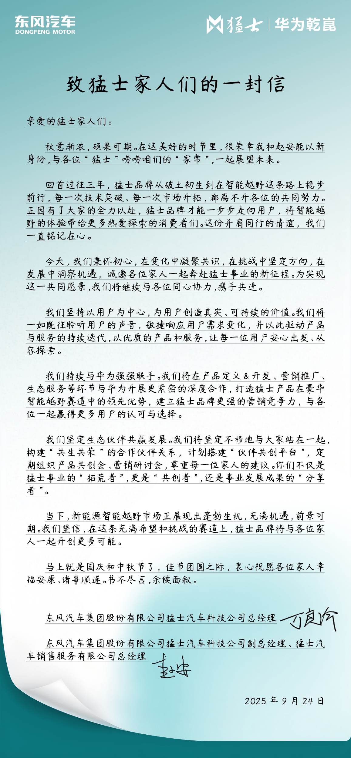十一前夕,东风汽车集团股份有限公司猛士汽车科技公司总经理万良渝,东风汽车集团股份有限公司猛士汽车科技公司副总经理、猛士汽车销售服务有限公司总经理赵安双双履新,并联手为猛士全体经销商写了《致猛士家人们的一封信》。这封情真意切的“家书”不仅回顾了猛士品牌三年的创业历程,更奏响了猛士品牌三年蓄力再出发的号角,坚定了以用户为中心、与华为深化合作、构建伙伴生态三大方向,共同推动猛士品牌在智能越野新征程上行稳致远。