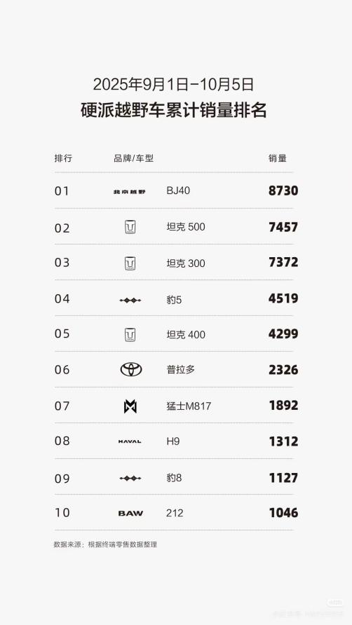 作为双方联合打造的首款车型,猛士M817已实现销量与口碑双丰收:预售1小时内突破9713台,上市5小时大定订单超3700台,并且自8月上市以来,不仅口碑位列同级第一,更成功跻身豪华新能源越野第一阵营,9月1日-10月5日,以1892台的成绩居硬派越野车累计销量排名第七,成为智能越野赛道的现象级产品。