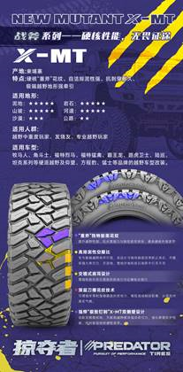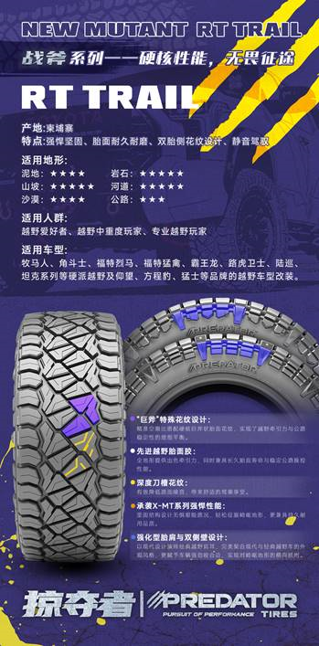 其独特的高辨识度的巨斧结构胎面纹路,在显著提升越野性能的同时,还避免了泥地轮胎常见的路面噪音问题。让你强悍征服,亦能体面归来。是全场景时代最理性的平衡之选。